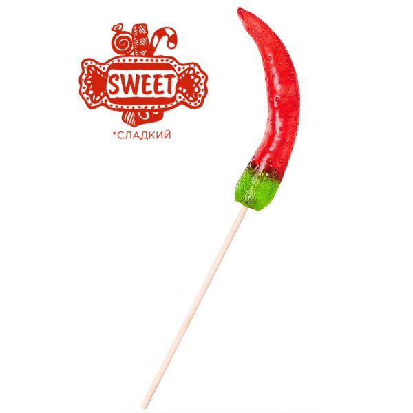 Яркая и вкусная леденцовая карамель на палочке в форме перчика станет приятным дополнением подарка на любой из праздников!
