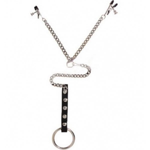 Зажимы имеют резиновое покрытие, регулировка давления происходит с помощью винта. Так же очень хорошо таким способом можно наказать провинившегося партнёра. Интересное изобретение для сексуальных забав. Зажимы для сосков обладают удивительной возбуждающей силой, а когда при этом они еще соединены металлической цепью с пенисом, который зажат в холодном кольце металла, то возбуждение усиливается многократно.