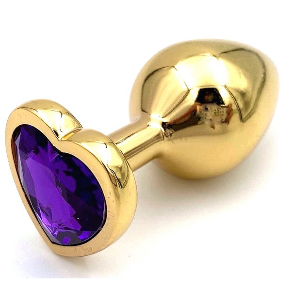Золотая металлическая анальная пробка M с фиолетовым камушком в виде сердечка