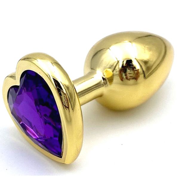 Золотая металлическая анальная пробка S с фиолетовым камушком в виде сердечка