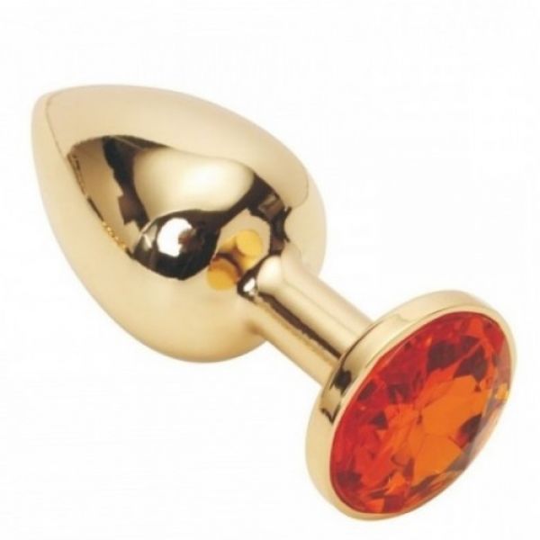 Золотая металлическая анальная пробка с камушком оранжевого цвета M