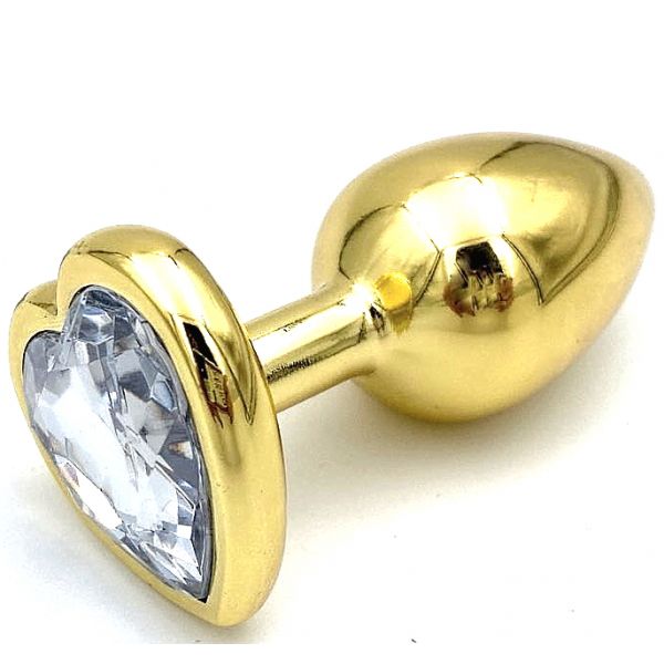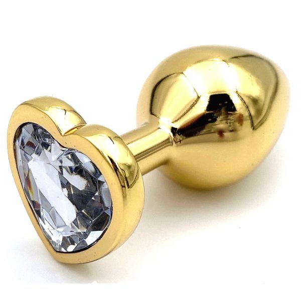 Золотая металлическая анальная пробка S с прозрачным камушком в виде сердечка