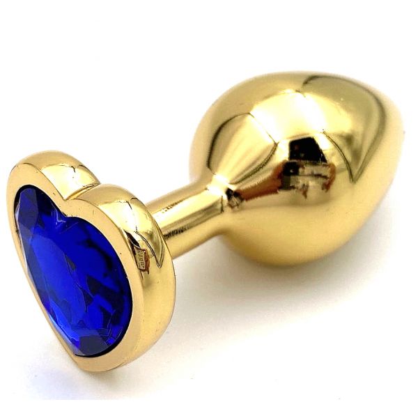 Золотая металлическая анальная пробка M с синим камушком в виде сердечка